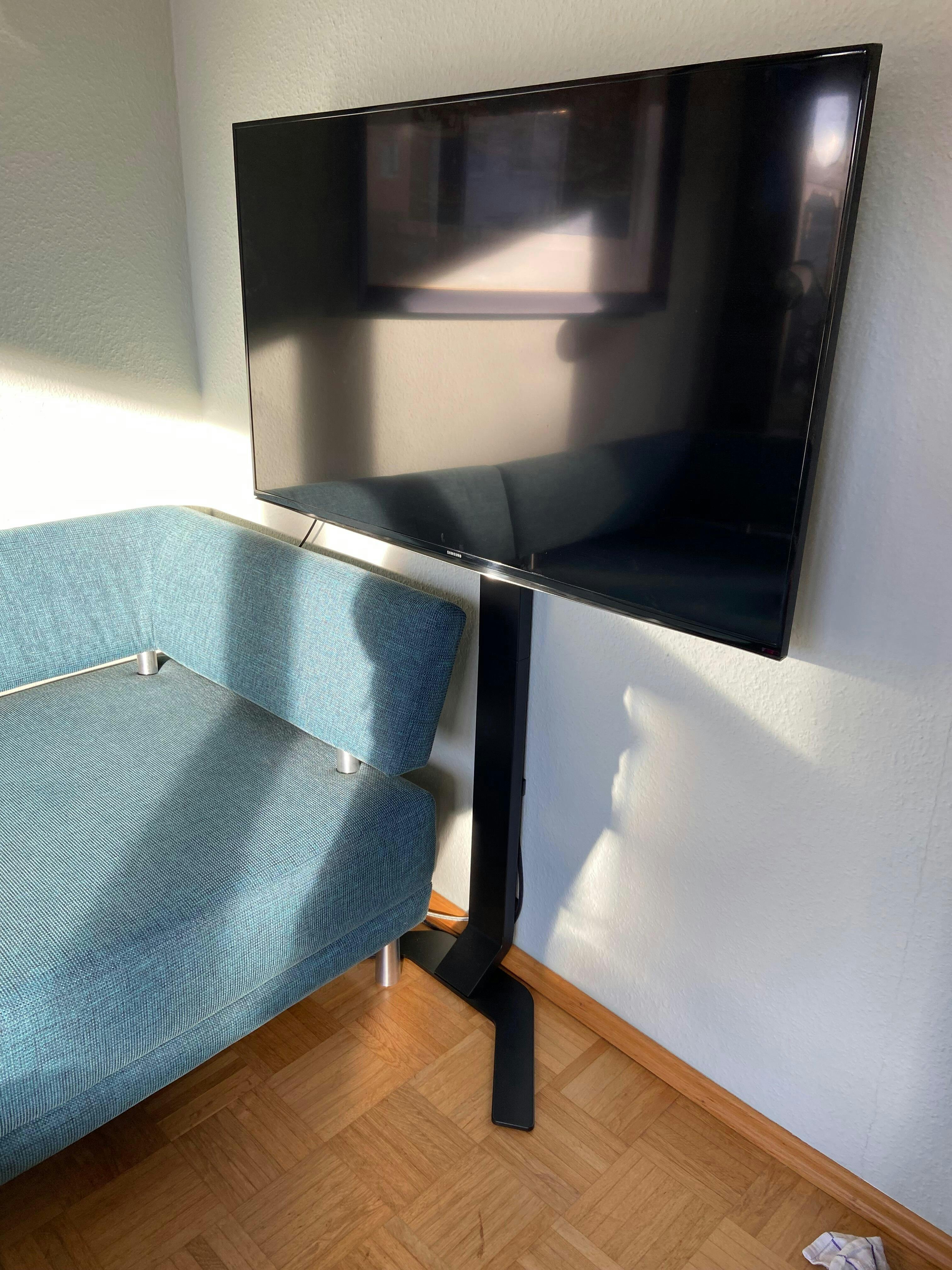 Ultraschlanker Standfuß mit TV-Halterung - dichte Platzierung an einer Wand und hinter TV-Lowboards bringt die Vorteile einer Wandhalterung ganz ohne Lochbohrungen